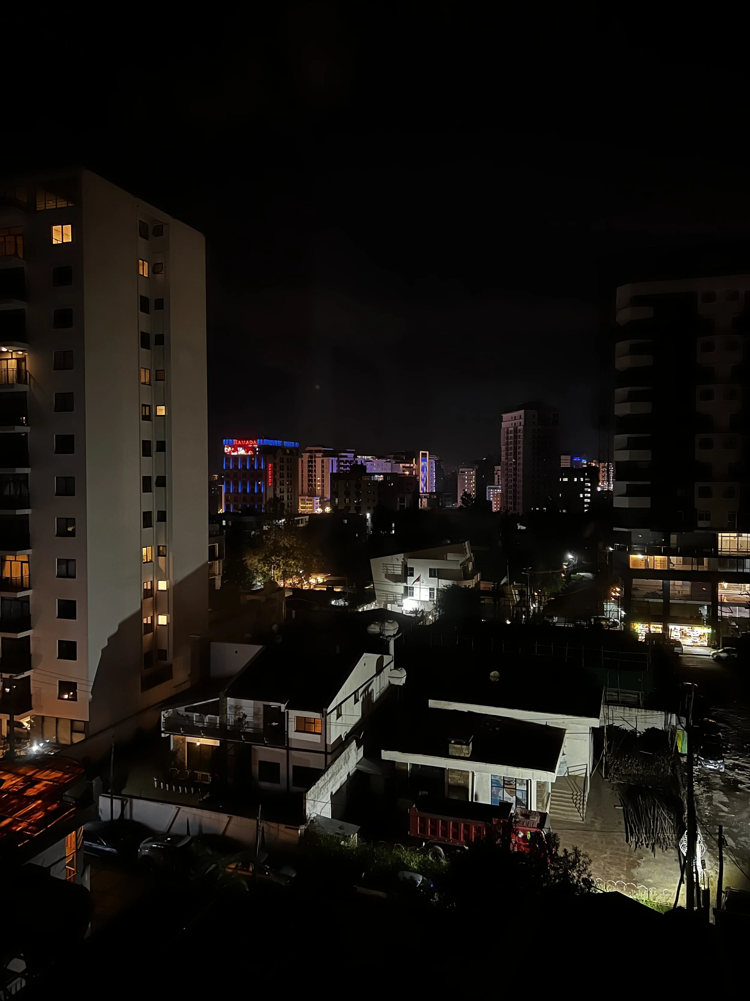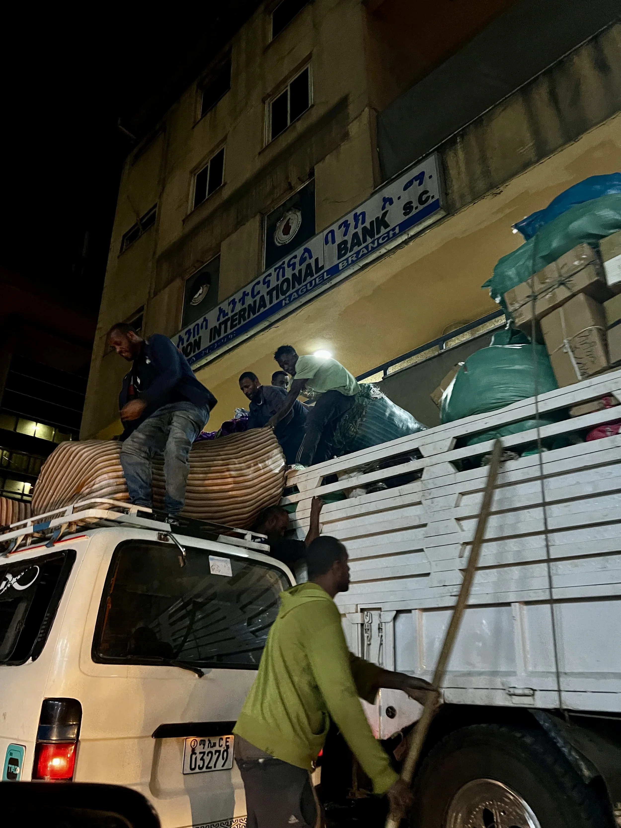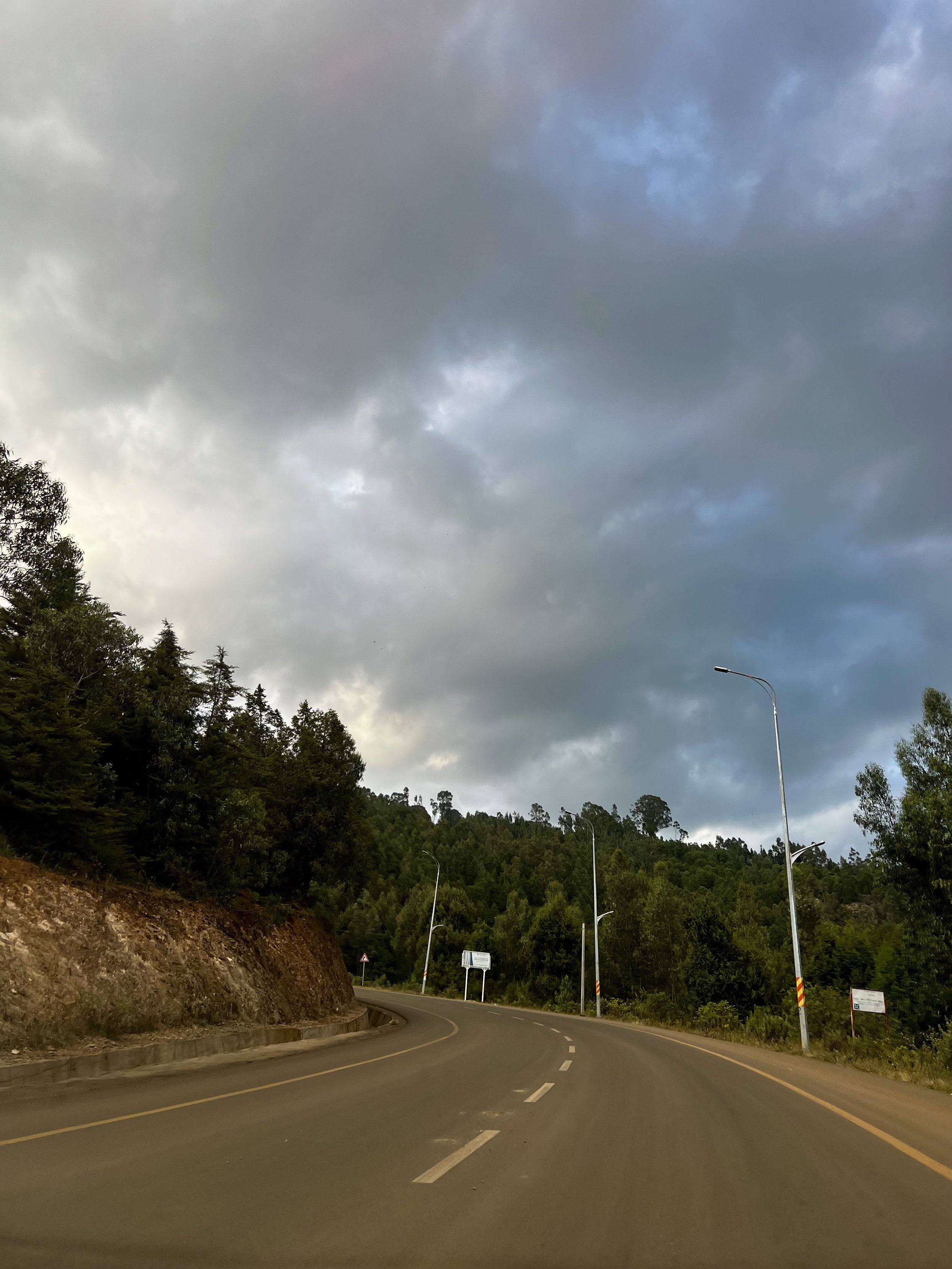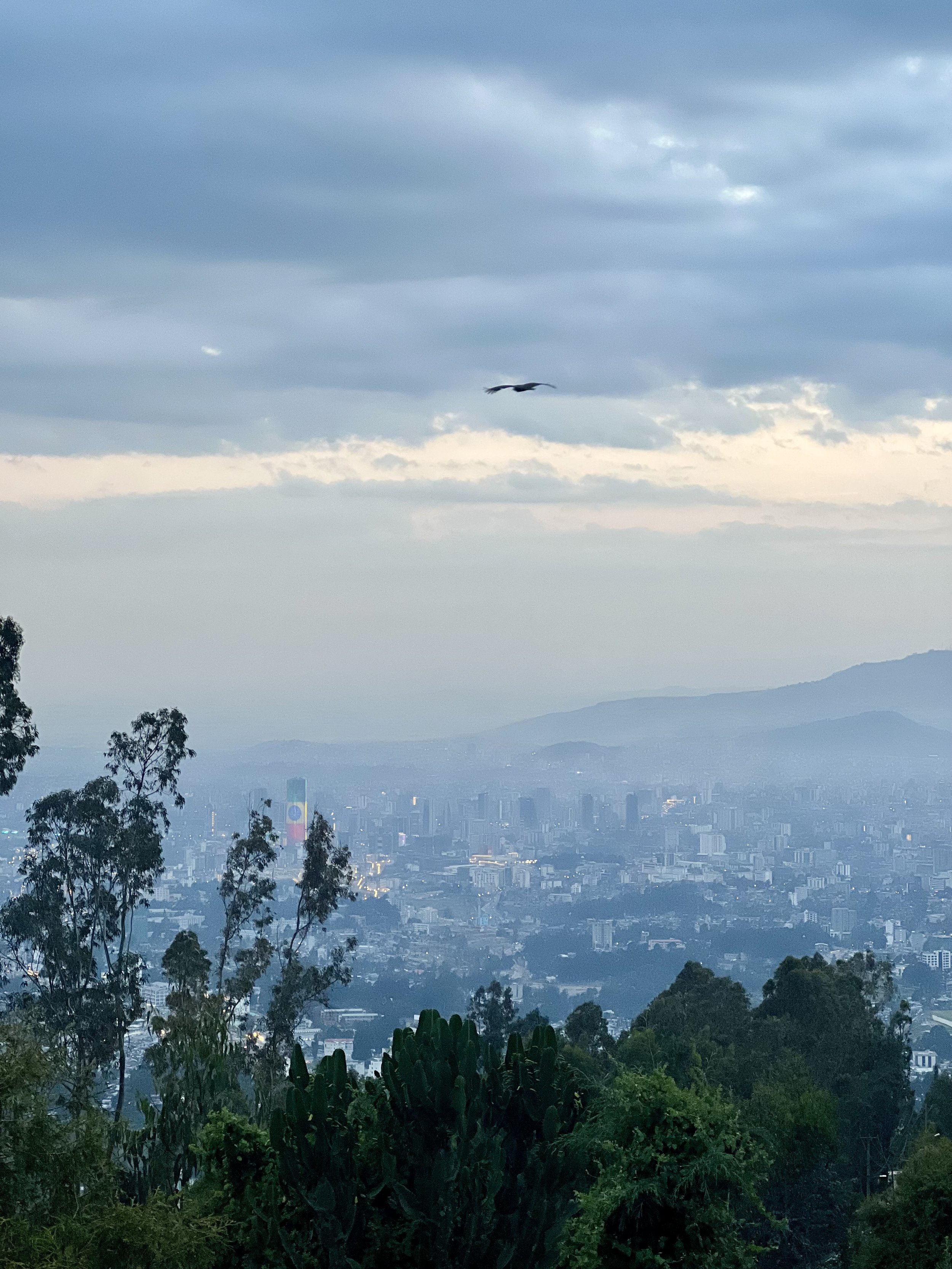 We caught the last of the sunset during our drive down from Entoto — eucalyptus forests pressing close on both sides, panoramic views of Addis Ababa opening below us, fresh mountain air filling the car. I could have stayed in that descent indefinitely. The city sprawled beneath us, lit and insatiable, perpetually in motion.