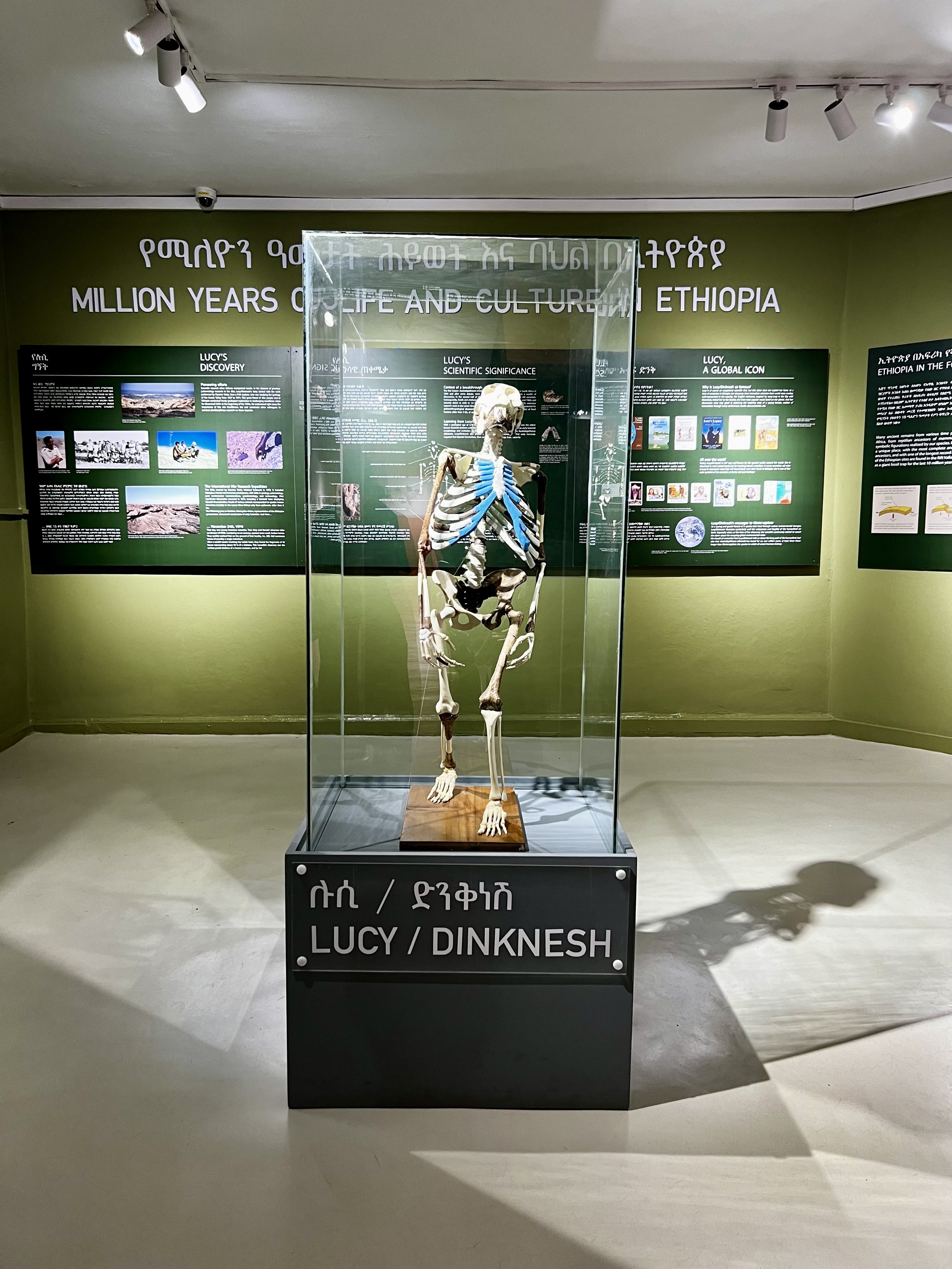 This museum is home to Lucy — known in Ethiopia as Dinknesh, meaning "you are wonderful." Her fossil, discovered in 1974, is 3.2 million years old, and roughly forty percent intact. At the time of her discovery, she was the most complete early-human ancestor skeleton ever found. She is compelling not merely as a relic, but as evidence. Her bones confirmed that bipedalism — walking upright on two legs — preceded the development of large brains. She rewrote the story of what it means to be human.