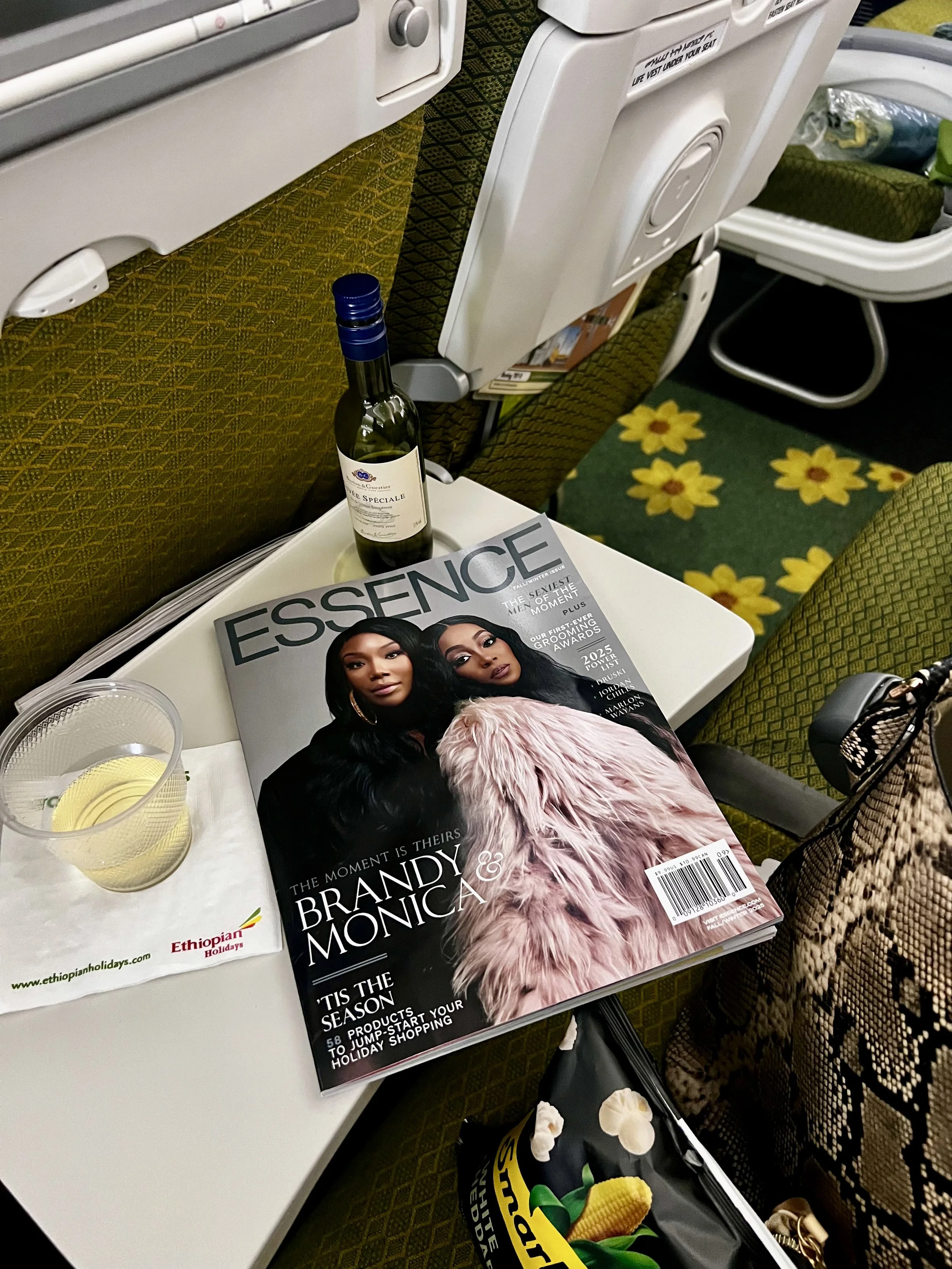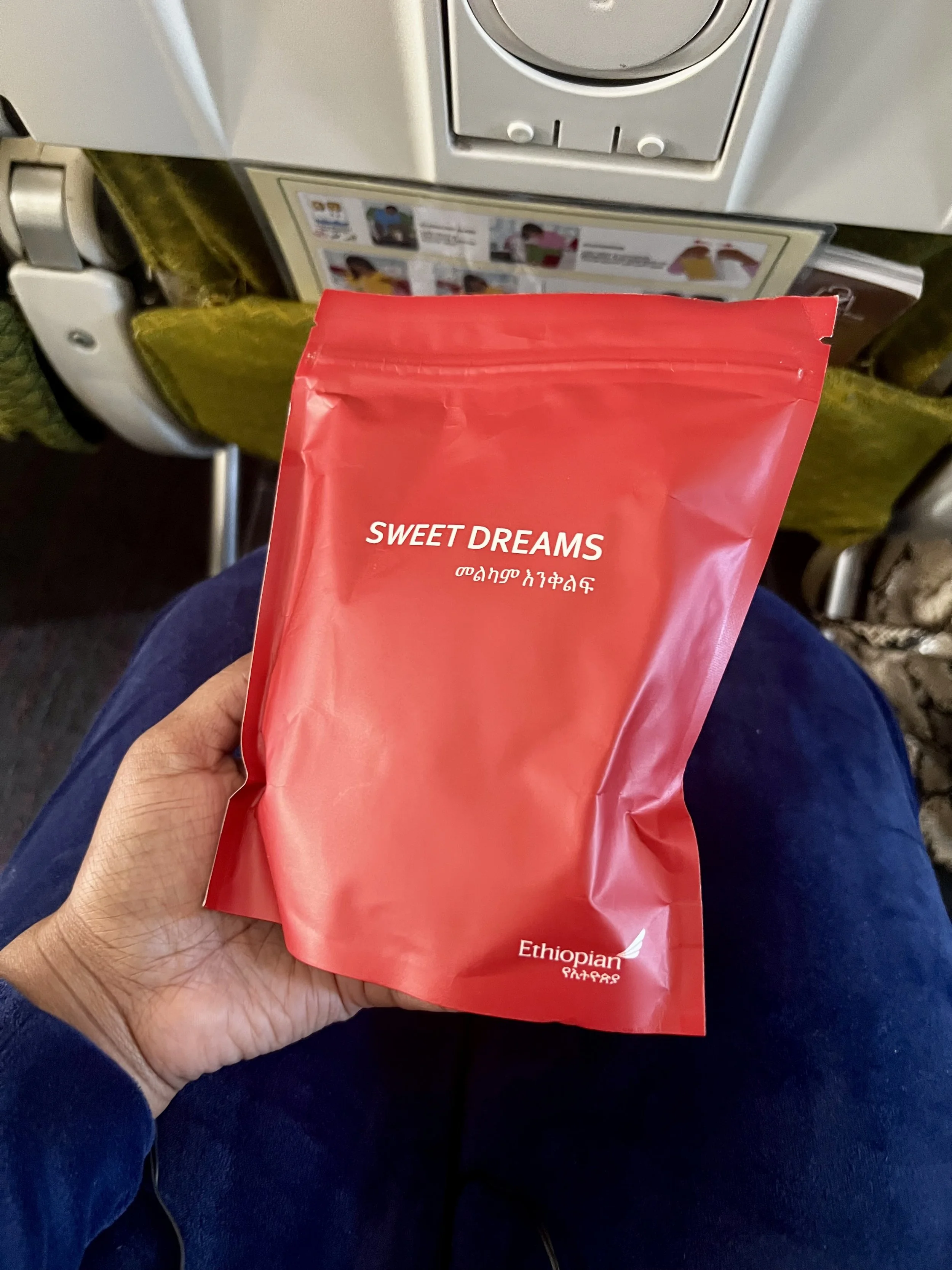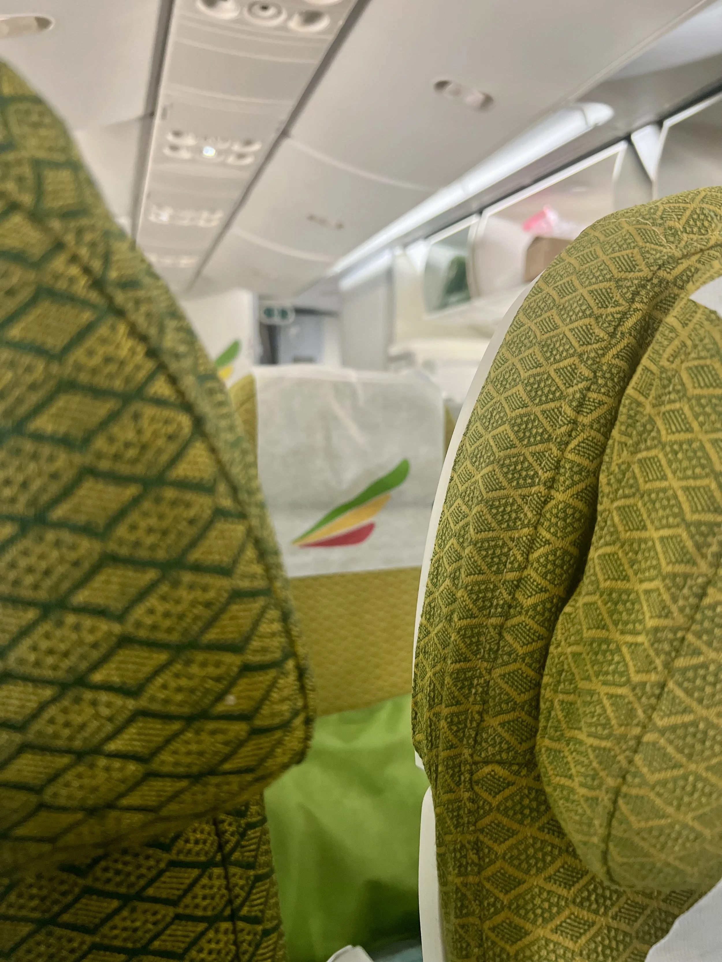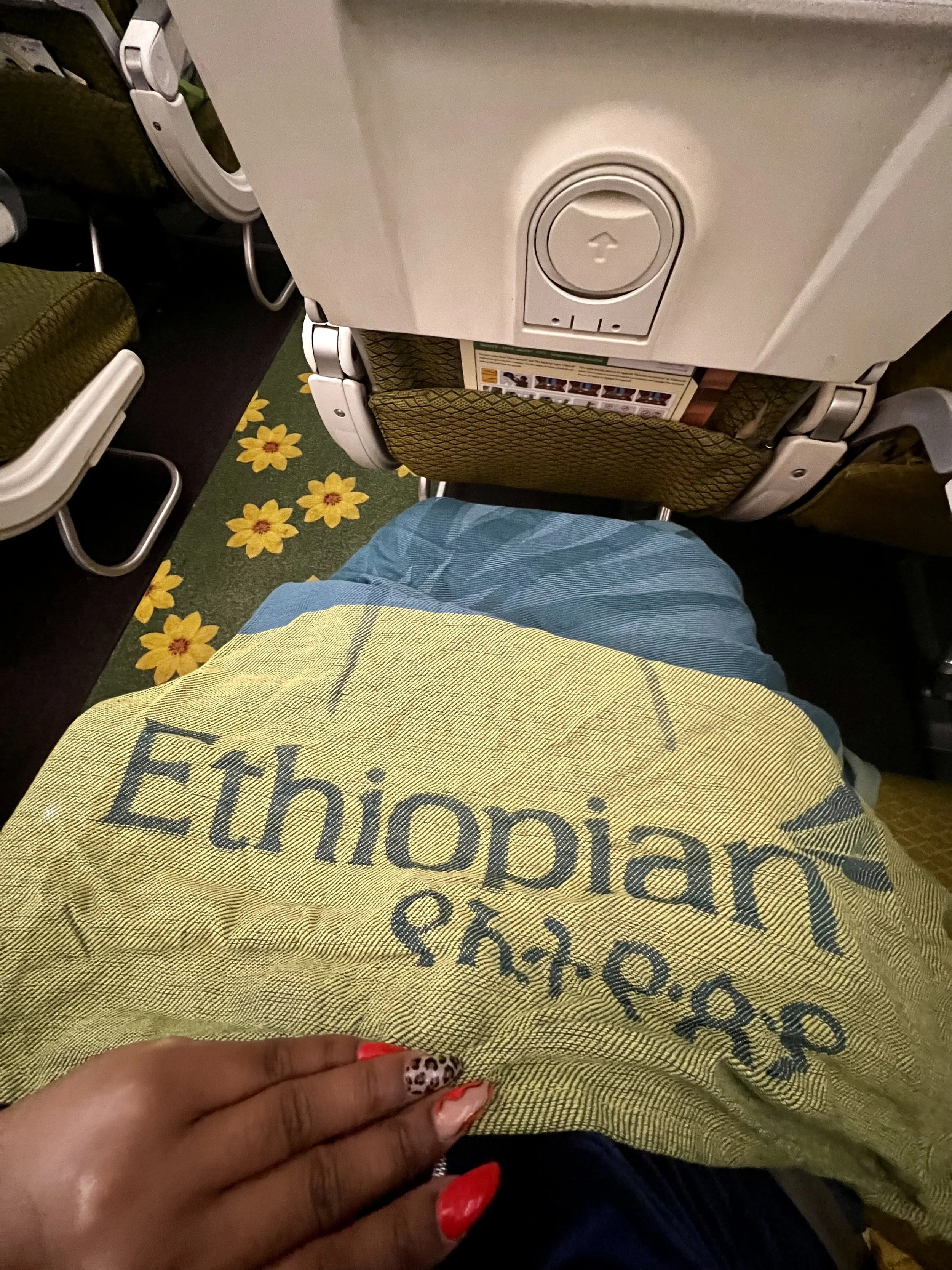 From the warm welcome to the personalized mini travel gift bag and blanket, you’re immersed in Ethiopian culture right away. What stood out most to me were the subtle design touches: the seat coverings and flooring feature floral symbols with deep meaning. The yellow Adey Abeba (Meskel flower) represents renewal, hope, and the Ethiopian New Year (Enkutatash), while the white Calla Lily, recognized as Ethiopia’s national flower - symbolizes peace, purity, and holiness.